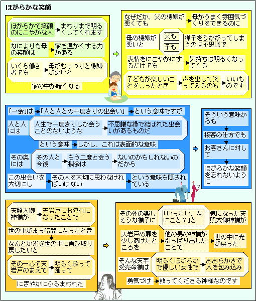 政治の世界で笑顔に関するお話があるのは、天照大御神が岩屋に隠れたとき、天岩戸のまえで、明るく歌って踊って、にぎやかにして、天照大御神を連れ出すキッカケを造った話しぐらいなのでしょうか?